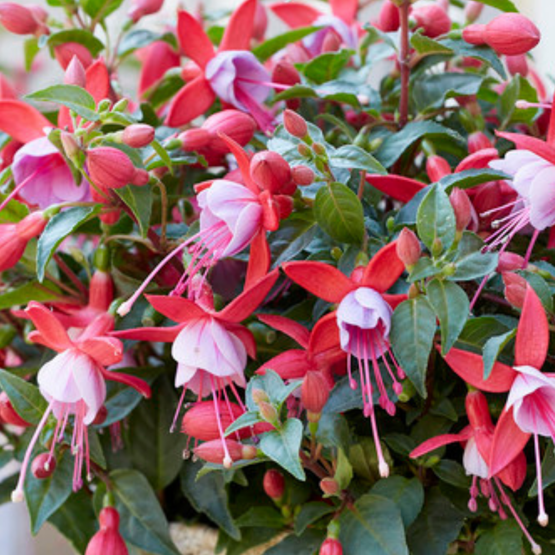 These carefully selected fuchsias are known for their distinctive, pendulous bell-shaped flowers, produced in abundance from late spring through autumn. Blooms appear in striking two-tone combinations — soft pinks, crisp whites, rich reds, purples & violets — creating eye-catching contrast against fresh green foliage. Whether cascading elegantly from baskets or standing upright with lush, bushy form, these plants deliver movement, texture & colour throughout the season.