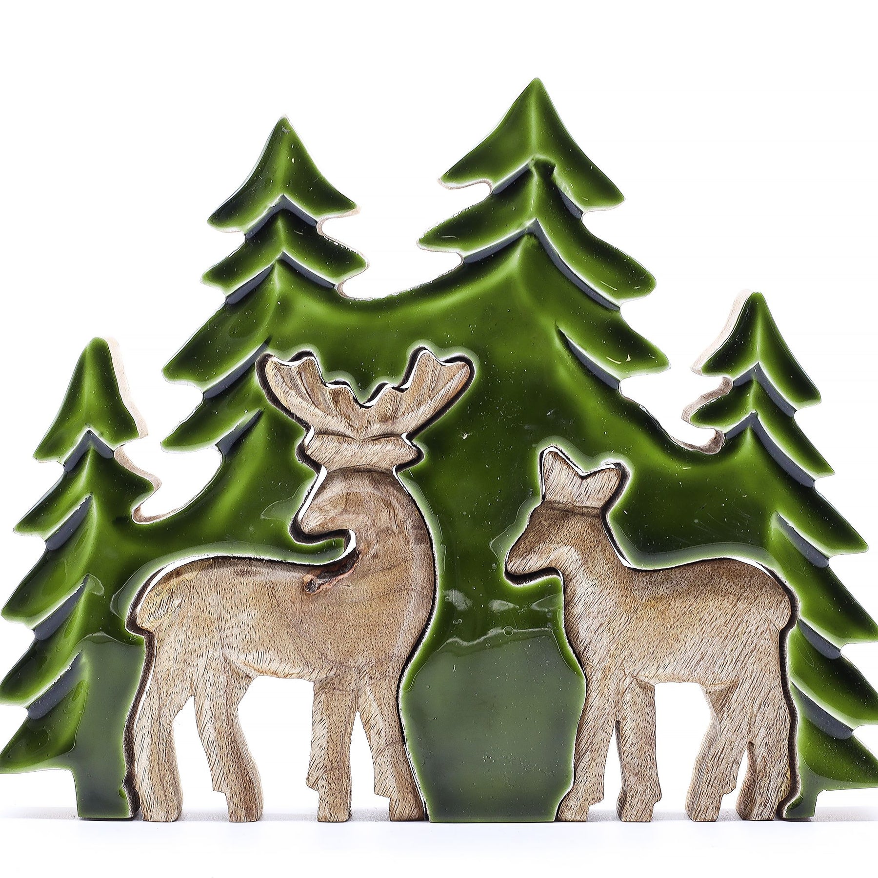 Celebrate the quiet beauty of nature with this Two Deer in the Forest ornament from the Lost in the Forest collection. Hand-carved from sustainable mango wood and accented with deep green enamel, this woodland scene features two deer standing peacefully among towering fir trees. The layered 3D effect brings the setting to life, making it a heartwarming focal piece for seasonal displays.